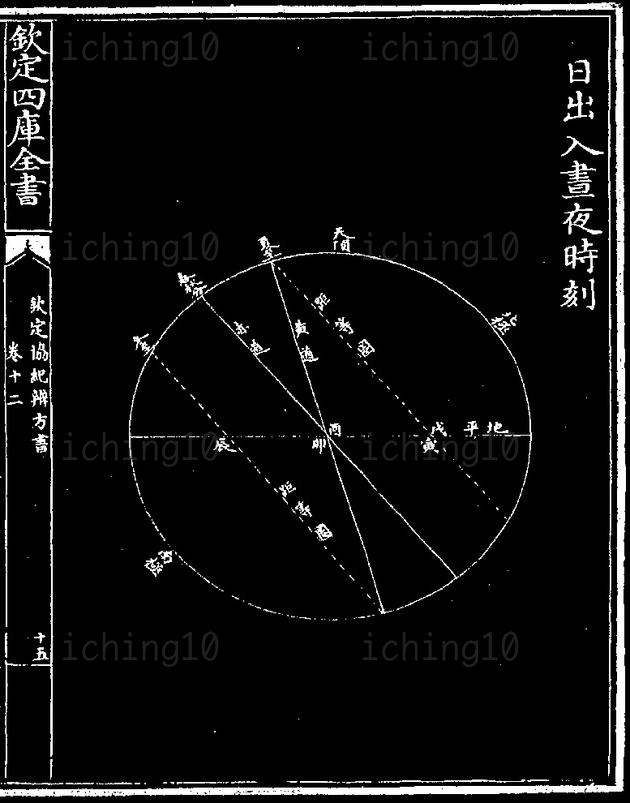 蓋日行黄道與赤道斜交春秋分日行正當交點與地平交於卯酉地平上下之度相等故晝夜適均所謂日中宵中也春分以後日行赤道内至夏至而極其距等圈與地平交於寅戌地平上下之度上多下少故晝長夜短所謂日永也秋分以後日行赤道外至冬至而極其距等圈與地平交於辰申地平上下之度上少下多故晝短夜長所謂日短也二分前後距交不遠黄道勢斜則緯行疾故數日而差一刻二至前後黄道勢平則緯行遲故半月而差一刻此永短由日行之内外而生者也
