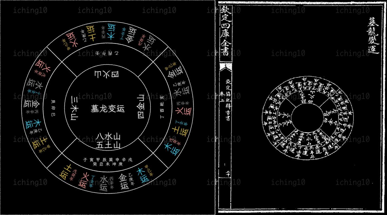 按墓龍者本山龍洪範五行之墓庫變運者本墓庫之納音隨歲運而變者也用五子元遁者與七政自冬至起算同義上年冬至已屬今年今年冬至即屬明年天地之運皆自子始也然五子元遁始子終亥而一歲統四時冬至後丑月歲君未更而墓運已改丑為金墓故金山之墓運冬至後又重變也如甲山正運屬水水墓在辰甲己年五子元遁自甲子順數得戊辰納音屬木即為木運乾山屬金金墓在丑甲巳年五子元遁自甲子順數得乙丑納音屬金即為金運冬至後屬乙庚年用乙庚年五子元遁自丙子順數得丁丑或用甲巳年五子元遁自甲子順數至乙亥又進而順數至丑亦得丁丑納音屬水即為水運餘倣此