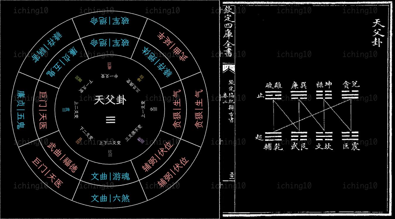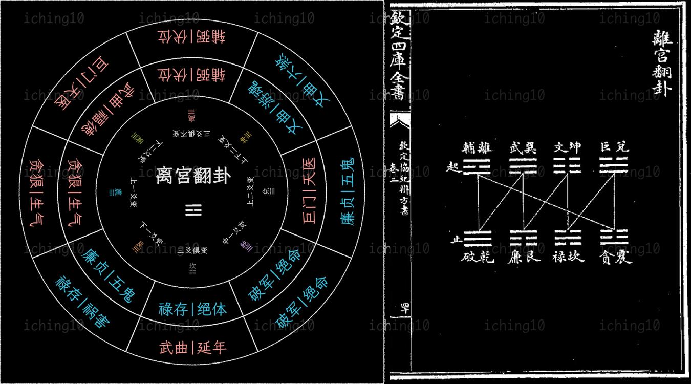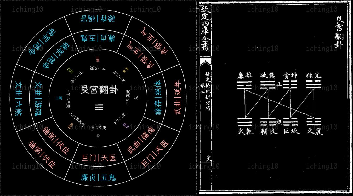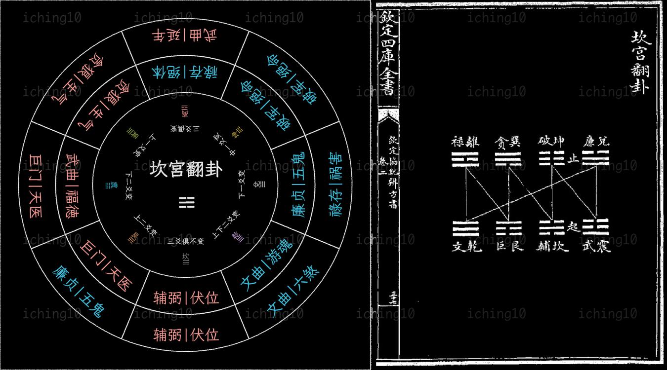 按翻卦之法皆以上一爻變為生氣貪狼上二爻變為天醫巨門下一爻變為五鬼廉貞下二爻變為福德武曲上下二爻變為遊魂文曲中爻變為絶命破軍三爻俱變為絶體禄存三爻俱不變為伏位輔弼蓋取上一爻變上二爻變或下一爻變下二爻變者則乾坤坎離四陽卦必變為震艮兌巽之四隂而四隂卦必變為四陽故為三吉以取坐山之用地理家所謂陽龍坐隂山立陽向隂龍坐陽山立隂向是也山與向既有隂陽之不同故論向者又自本宫五鬼方之對位起貪狼而以本宫與五鬼互易謂之五鬼卦如乾為本宫巽為五鬼乃轉以巽為本宫自巽對宫坎上起貪狼坤為巨門震為禄存兌為文曲乾為五鬼離為武曲艮為破軍巽為輔弼然後乾巽互易仍以乾為本宫巽為五鬼則所得坎坤離之三吉又皆與乾本宫成淨陽而其卦變遂一上一下以輔武破廉貪巨禄文為序然則變卦之吉凶皆以所分之隂陽為定耳未必有深義也或謂按諸卦例亦有合焉者其說曰先天八卦上一爻變者本象所生隂陽相配相生相比是猶同氣而相得者也故為生氣上二爻變者本儀所生奇偶相配相制而不相害是猶補偏而救弊者也故曰天醫下一爻變者陽往交隂隂往交陽往為屈屈為鬼而卦序皆相隔五位故曰五鬼下二爻變者老少同情隂陽交易志相得氣相生故為福德上下二爻變者陽儀隔位而交于隂隂儀隔位而交于陽隂陽奇偶俱不相配故曰遊魂中一爻變者陽儀隔位而還于陽隂儀隔位而還于隂其氣反歸而交尅故曰絶命三爻俱變則卦位對衝全非本體故曰絶體三爻俱不變則自得本宫故曰伏位猶云伏吟者也在八宫卦象則上爻持世卦為本宫伏位初世卦為五鬼二世卦為福德三世卦為絶體四世卦為天醫五世卦為生氣遊魂卦為遊魂歸魂卦為絶命如乾遇乾則成重乾為上爻持世卦是為伏吟乾巽相遇則成姤小畜皆初世卦為五鬼乾艮相遇則成遯大畜皆二世卦為福德乾坤相遇則成泰否皆三世卦為絶體乾震相遇則成无妄大壯皆四世卦為天醫乾兌相遇則成履夬皆五世卦為生氣乾坎相遇則成需訟皆遊魂卦為遊魂乾離相遇則成同人大有皆歸魂卦為絶命餘皆倣此今按先天之說甚巧其八宫卦象則唯絶體遊魂絶命與卦變義合餘無所取蓋特以此為記耳圖列於後