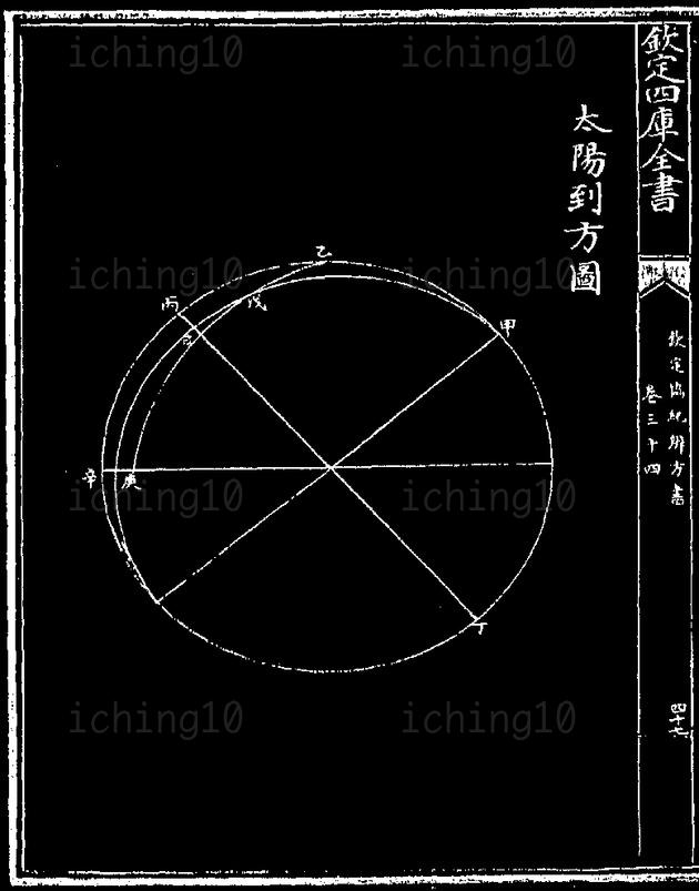 甲為北極乙為京師天頂甲乙相距五十度五分丙丁為赤道戊為太陽甲戊為夏至太陽去極六十六度三十分即戊己之餘戊庚為高弧庚辛為太陽地平經度距午七度三十分即庚乙辛角用弧三角形法法見考成上編求得戊甲乙角二度二十六分即丙己弧為太陽距午赤道度變時得十分以減午正得午初三刻五分為太陽到午方時刻以加午正得午正初刻十分為太陽到丁方時刻也餘倣此推
